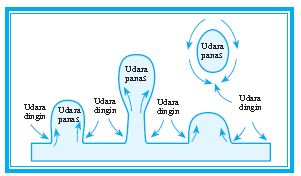 Turbulensi, yaitu penyebaran panas secara berputar-putar. Hal ini menyebabkan udara yang sudah panas bercampur dengan udara dingin sehingga udara yang dingin ini akan menjadi panas pula. Daerah dingin yang terkena turbulensi udaranya akan menjadi hangat.