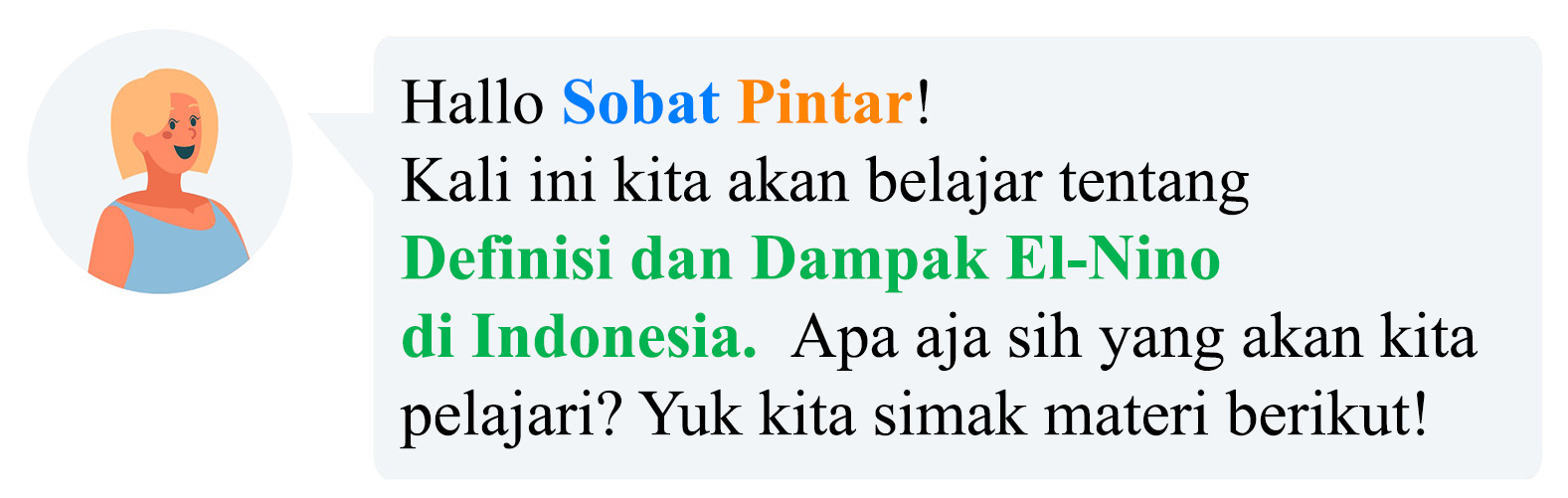 EL NINO datang mengganggu setiap dua tahun sampai tujuh tahun sekali. Samudera Pasifik, mulai Pasifik Tengah sampai dengan pantai Peru di Amerika Selatan menjadi hangat, tetapi tidak demikian di perairan Australia sebelah utara dan Indonesia. Apabila hal ini terjadi, angin pasat akan melemah dan arahnya berbalik, yakni berembus dari arah barat ke arah timur. Jadi, udara tropis yang lembap tidak berpusat di dekat Benua Australia.