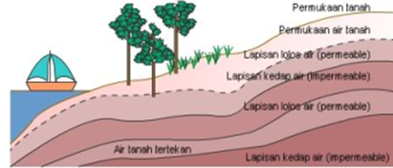 Yaitu aquifer yang seluruhnya jenuh air, dimana bagian atasnya dibatasi oleh lapisan semi lolos air dibagian bawahnya merupakan lapisan kedap air.