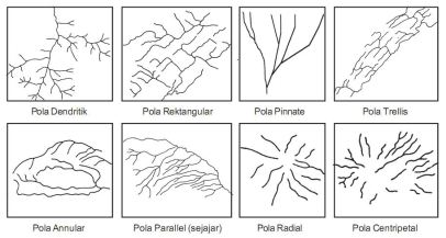 Pola aliran sungai dipengaruhi oleh struktur geologi dan permukaan daerah yang dilalui. Macam pola aliran sungai sebagai berikut.