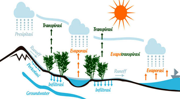 - Run off, yaitu pergerakan aliran air di permukaan tanah melalui aliran selokan, kanal, sungai, dan anak sungainya.