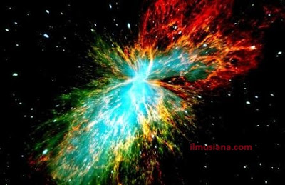 Ledakan dahsyat itu menimbulkan gelembung-gelembung alam semesta yang menyebar dan menggembung ke seluruh penjuru, sehingga membentuk galaksi, bintang-bintang, matahari, planet-planet, bumi, bulan dan meteorit. Bumi kita hanyalah salah satu titik kecil saja di antara tata surya yang mengisi jagat semesta. Di samping itu banyak planet lain termasuk bintang-bintang yang menghiasi langit yang tak terhitung jumlahnya. Boleh jadi ukurannya jauh lebih besar dari planet bumi. Bintang-bintang berkumpul dalam suatu gugusan, meskipun antarbintang berjauhan letaknya di angkasa. Ada juga ilmuwan astronomi yang mengibaratkan galaksi bintang-bintang itu tak ubahnya seperti sekumpulan anak ayam, yang tak mungkin dipisahkan dari induknya. Jadi di mana ada anak ayam di situ pasti ada induknya. Seperti halnya dengan anak-anak ayam, bintang-bintang di angkasa tak mungkin gemerlap sendirian tanpa bintang lainnya. Sistem alam semesta dengan semua benda langit sudah tersusun secara menakjubkan dan masing-masing beredar secara teratur dan rapi pada sumbunya masing-masing.