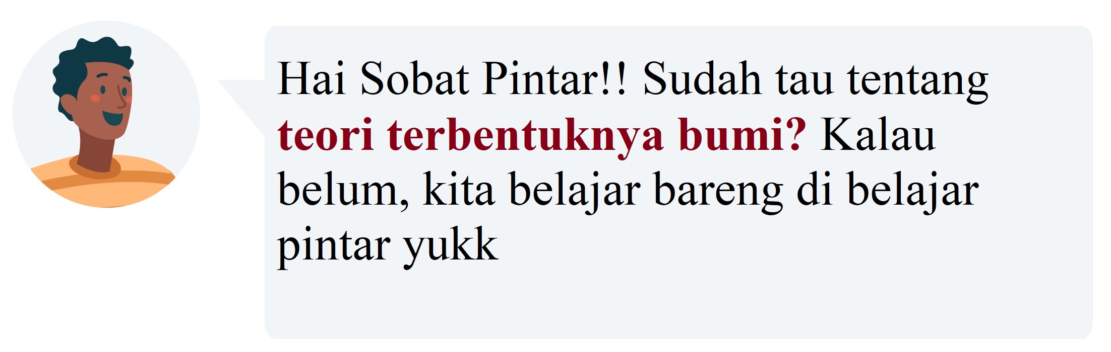 Ada banyak teori dan penjelasan tentang penciptaan bumi, mulai dari mitos sampai penjelasan agama dan ilmu pengetahuan. Kali ini kamu belajar sejarah sebagai cabang keilmuan, pembahasannya adalah pendekatan ilmu pengetahuan, yakni asumsi-asumsi ilmiah, yang kiranya juga tidak perlu bertentangan dengan ajaran agama.