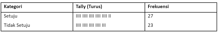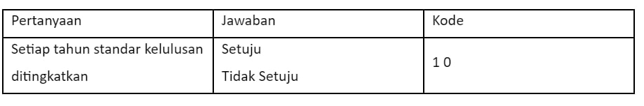 Contoh tabulasi langsung untuk jawaban dengan pertanyaan, “Apakah kamu setuju jika standar kelulusan setiap tahun dinaikkan?” Diperoleh hasil sebagai berikut: