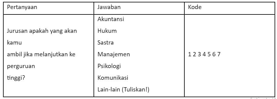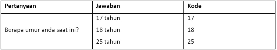 1) Pengkodean untuk jawaban berupa angka, seperti umur, jumlah siswa, pendapatan, dan lain-lain. Contoh angket dengan jawaban dan kode angka :