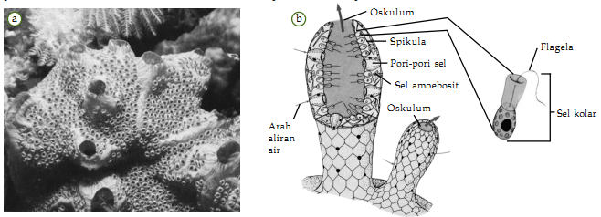 (a) Koloni Porifera yang terdapat di laut. (b) Aliran udara Porifera terjadi dari lua tubuh dan keluar melewati oskulum.