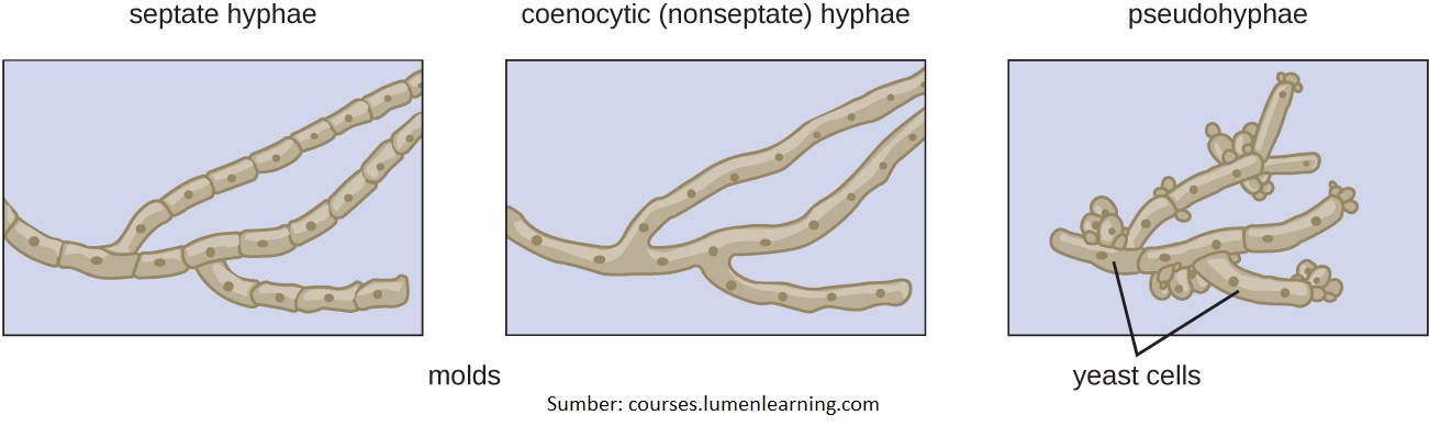 Hifa pada jamur. Sebagian jamur, tidak memiliki septa (sekat-sekat) pada hifanya.