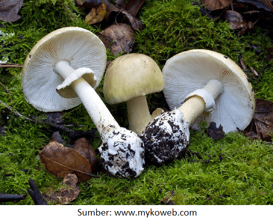 - Jamur beracun (Amanita phalloides), berwarna putih dan merah, hidup di tanah.