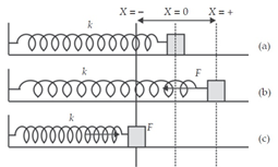 Gerak benda pada lantai licin dan terikat pada pegas untuk posisi normal (a), teregang (b), dan tertekan (c).