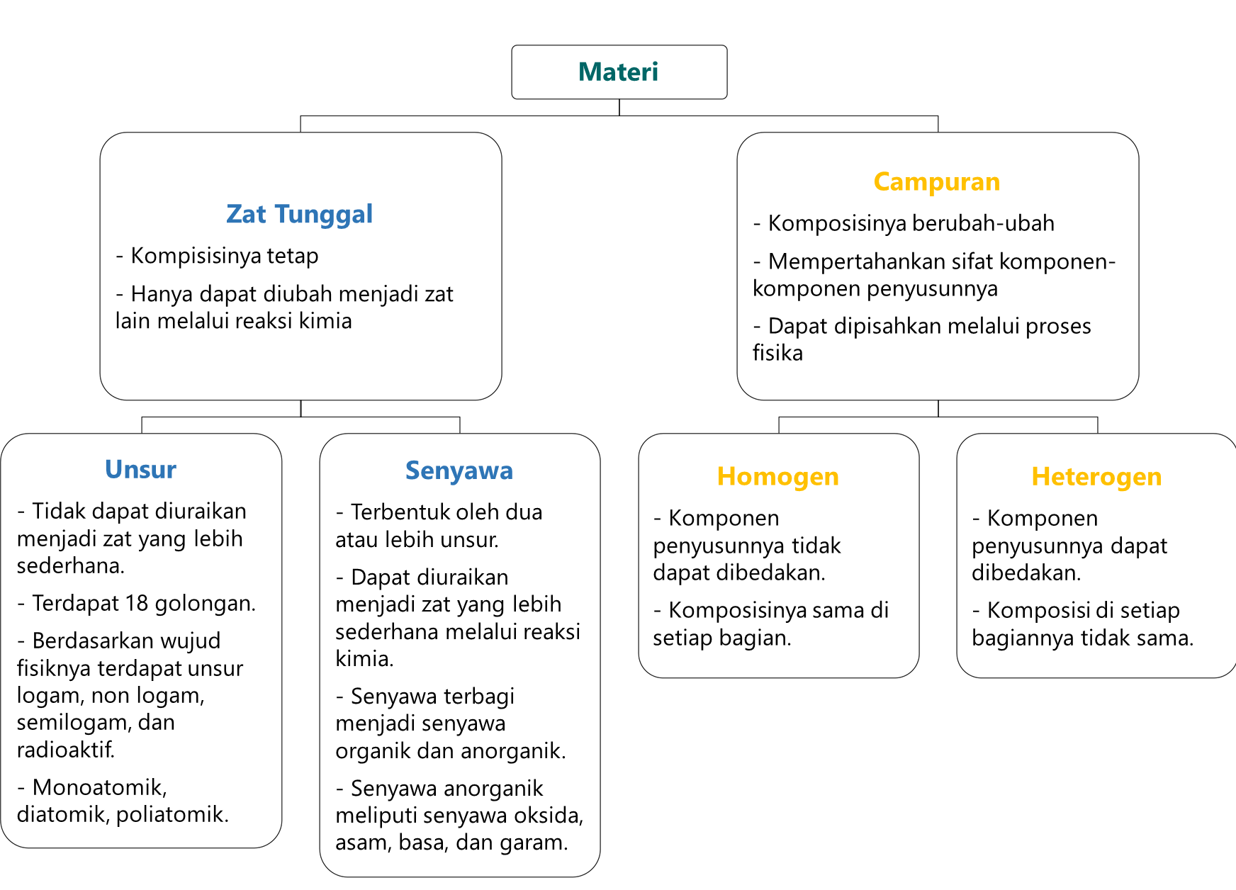 Materi merupakan segala sesuatu yang memiliki massa dan menempati ruang. Materi terbagi menjadi dua, yaitu zat tunggal dan campuran, perbandingan jenis-jenis materi tersebut dapat dilihat pada bagan klasifikasi materi berikut.