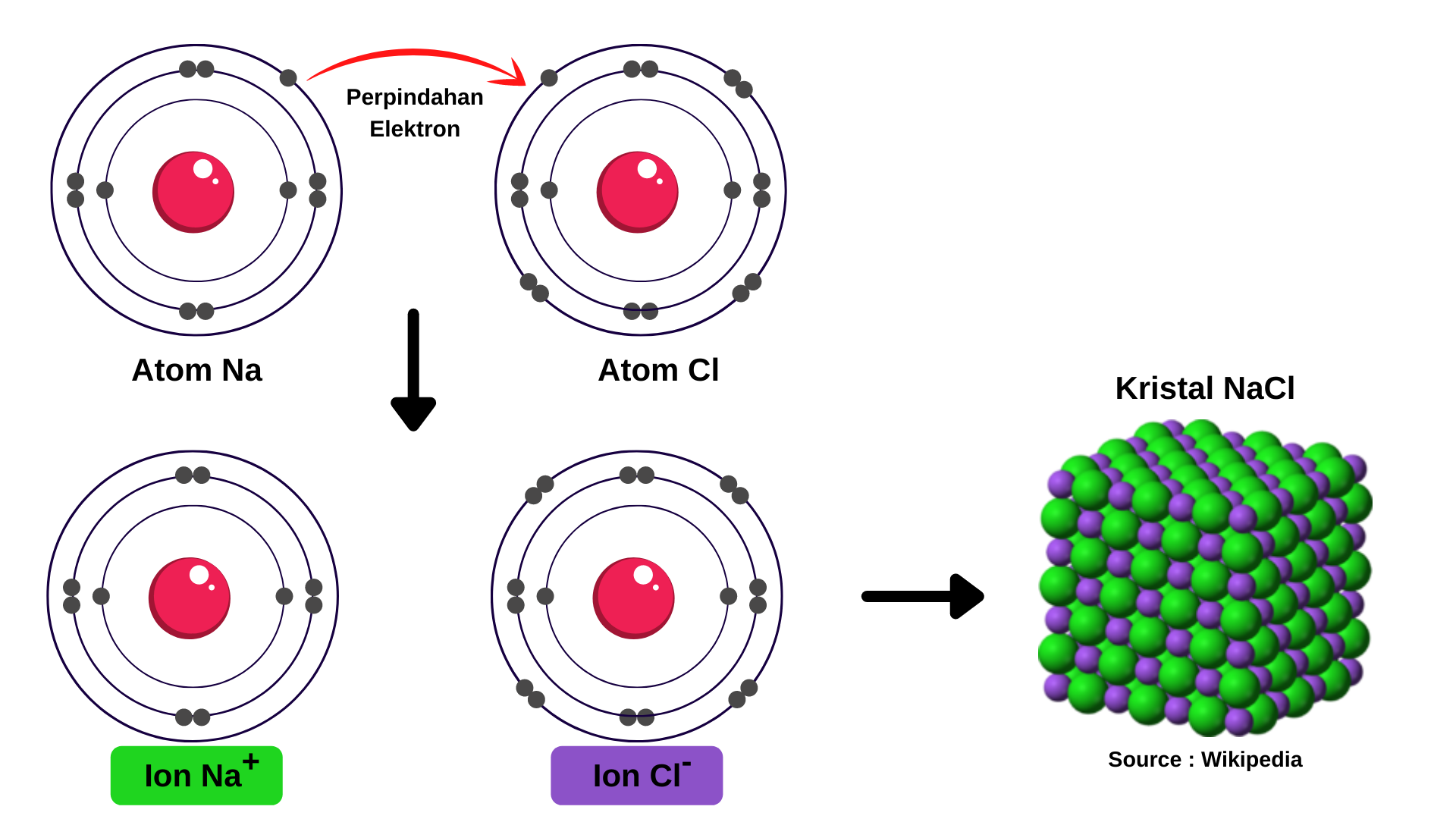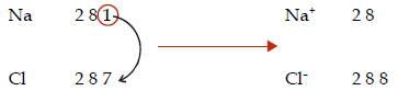 Berdasarkan kaidah oktet, untuk mencapai kestabilannya, atom Na harus melepaskan 1 elektron, sedangkan atom Cl membutuhkan 1 elektron. Atom Na akan bermuatan positif, sedangkan atom Cl akan bermuatan negatif. Dengan demikian, atom Na dan Cl dapat mencapai kestabilannya dengan cara serah terima elektron. Atom Na menyerahkan 1 elektron kepada atom Cl sehingga atom Cl menerima 1 elektron dari atom Na.