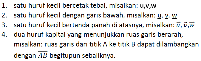 Seperti pada contoh vektor di atas, sebuah vektor dapat dinotasikan dengan beberapa ketentuan, diantaranya:
