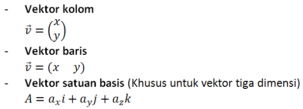 - Pada vektor basis, i : vektor satuan yang searah sumbu-x (absis), j : vektor satuan yang searah sumbu-y (ordinat), dan k : vektor satuan yang searah sumbu-z (aplikat). Sedangkan ax : komponen arah sumbu-x, ay : komponen arah sumbu-y, dan az : komponen arah sumbu z.