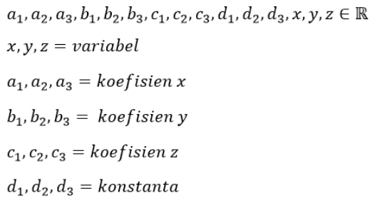 Persamaan Linear Tiga Variabel merupakan suatu persamaan berderajat satu yang memiliki tiga variabel. Bentuk umum dari persamaan linear tiga variabel yaitu