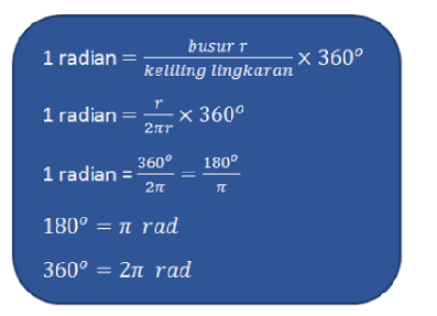 Hubungan ukuran sudut derajat dengan radian dapat dinyatakan sebagai berikut: