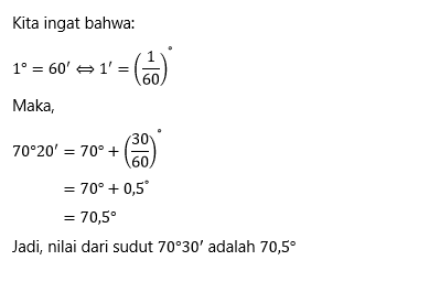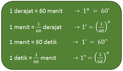 Hubungan ukuran sudut menit, detik, dan derajat dapat dinyatakan sebagai berikut: