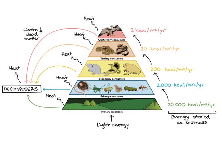 Aliran energi pada rantai makanan di mana energi berpindah dari suatu tingkat trofik ke tingkatan trofik lainnya sembari mengalami pengurangan (Sumber: Khan Academy)