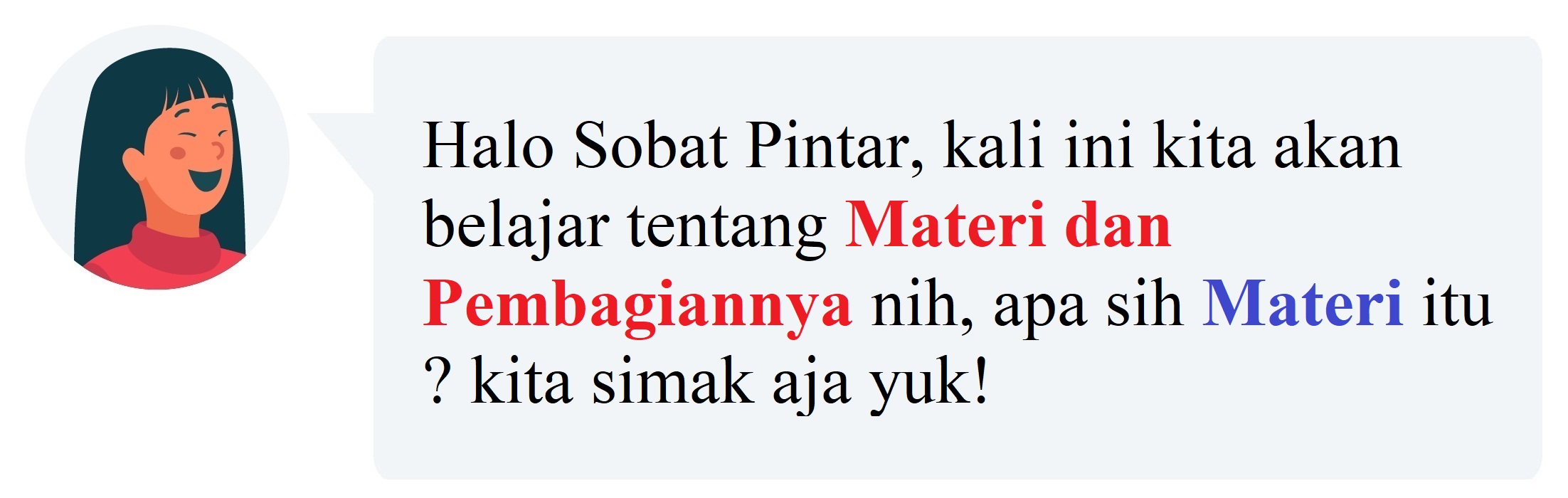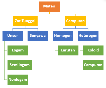 Materi merupakan segala sesuatu yang memiliki massa dan menempati ruang. Materi terbagi menjadi dua, yaitu zat tunggal dan campuran, perbandingan jenis-jenis materi tersebut dapat dilihat pada bagan klasifikasi materi berikut.