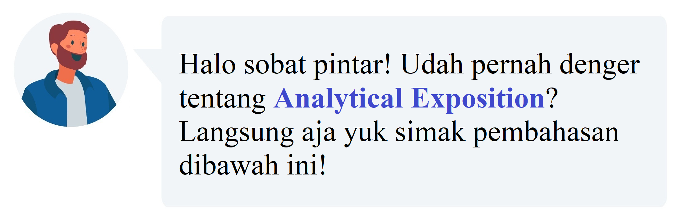 Analytical Exposition text adalah teks yang membahas sebuah topik secara kritis akan tetapi hanya berfokus pada salah satu pendapat. Pendapat dan sudut pandang dari kalian harus dijelaskan berdasar fakta dan informasi yang berhubungan. Pernyataan yang kamu jabarkan juga harus dituliskan kembali di bagian akhir. (Analytical Exposition Text is a text that discusses a topic critically but only focuses on one opinion. Your opinion and point of view must be explained based on facts and pertinent information. The statement that you describe must also be rewritten at the end.)
