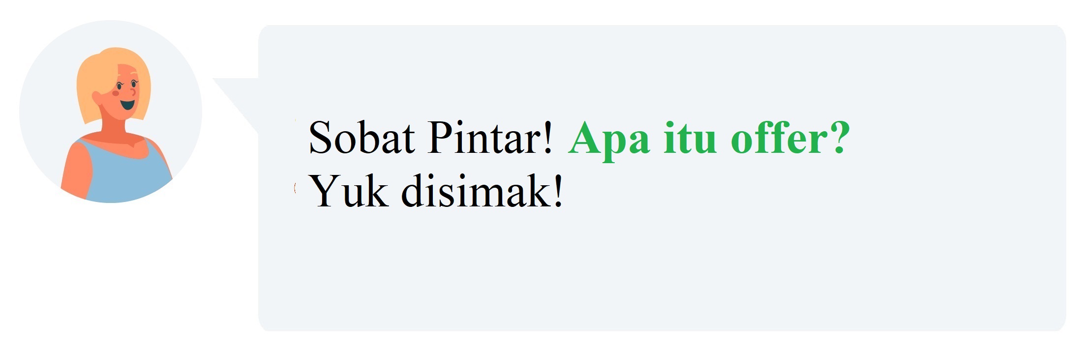 Yups, benar, jadi hal-hal yang dapat kita tawarkan adalah bantuan berupa jasa ataupun barang ke sesama ataupun juga orang yang lebih tua dari kita. Offer atau penawaran berarti memberikan sesuatu kepada orang lain yang dapat berupa benda fisik ataupun abstrak/ tidak terlihat/ bantuan. Dimana, penawaran tersebut dapat diberikan dalam berbagai bentuk seperti makanan, uang, solusi, undangan, persahatan atau tawar menawar. Maka, penawaran tersebut bisa diterima atau ditolak oleh orang yang ditawarkan tersebut. (Offer means to give something to another person which can be in the form of a physical object or abstract/invisible/help.)