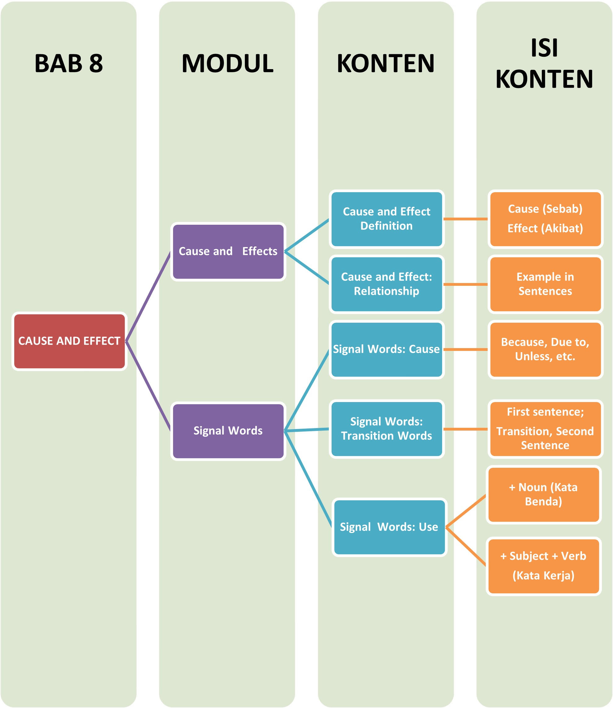 Cause and Effect menjelaskan mengapa sesuatu terjadi. Biasanya berfokus pada hubungan antara suatu tindakan atau sikap yang mengikutinya.