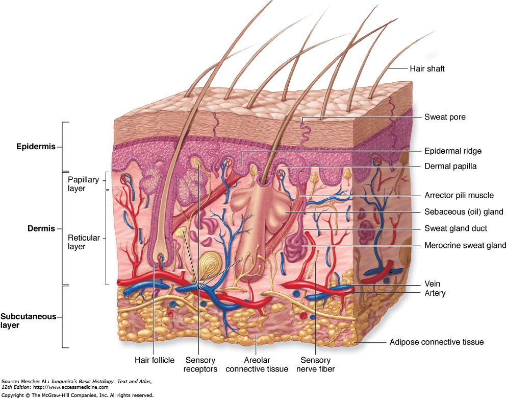 Pada lapisan dermis terdapat pembuluh darah, akar rambut, ujung saraf, kelenjar minyak (glandula sebassea), dan kelenjar keringat (glandula sudorifera). Kelenjar minyak terletak dekat akar rambut dan berfungsi meminyaki rambut. Kelenjar keringat menyerap cairan jaringan yang terdiri atas air, 1% larutan garam, dan urea.