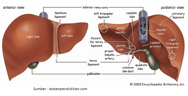 - Lobus kiri dan lobus kanan, dengan lobus kanan lebih besar dibandingkan dengan lobus kiri.