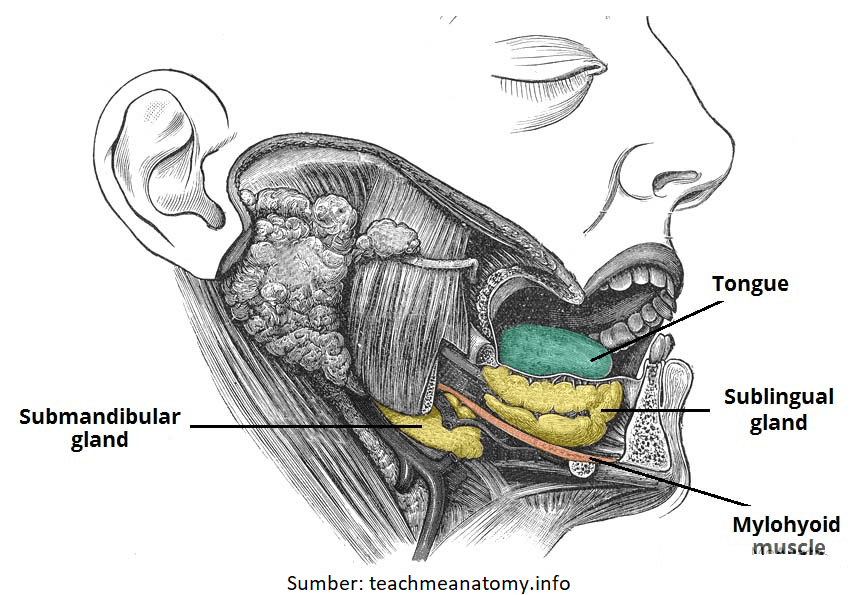- Kelenjar submandibularis berada di rahang bagian bawah, berfungsi menghasilkan getah yang mengandung air dan lendir.