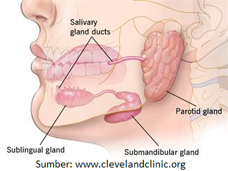 - Terdiri dari tiga pasang yaitu kelenjar parotid yang terletak di dekat telinga, kelenjar sublingual yang terletak di bawah lidah, dan kelenjar submandibula yang terletak di sudut rahang bawah.