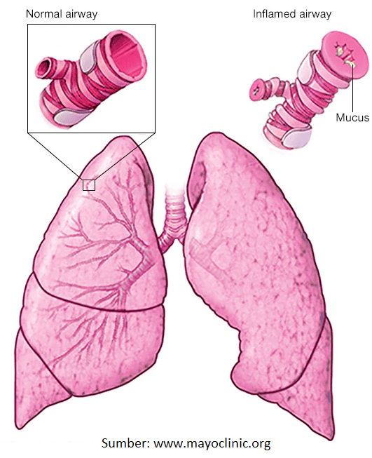 - Asma adalah gangguan pada rongga saluran pernapasan yang diakibatkan oleh kontraksi otot polos pada trakea dan mengakibatkan penderita sulit bernapas. ditandai dengan kontraksi yang kaku dari bronkiolus. Asma biasanya disebabkan oleh hipersensitivitas bronkiolus (disebut asma bronkiale) terhadap benda-benda asing di udara. penyebab penyakit ini juga dapat terjadi dikarenakan faktor psikis dan penyakit menurun.