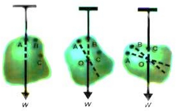 Jika kita gantung benda tersebut seperti pada gambar di atas, dari sembarang titik seperti A, maka benda akan berada pada kesetimbangan dibawah aksi tarikan pada tali dan resultan W dari gaya gravitasi yang bereaksi pada semua partikel benda tersebut. Resultan ini jelas kolinier dengan tali, dan misalkan kita menandai posisinya.
