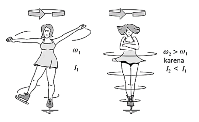 Pada gambar di atas penari diperlihatkan memulai rotasinya dengan kedua lengan terentang. Dengan melipat kedua lengannya, penari itu memperkecil momen inersianya terhadap poros (untuk mengecil maka juga mengecil) dan sebagai akibatnya, dia berputar lebih cepat (kecepatan sudut bertambah besar).