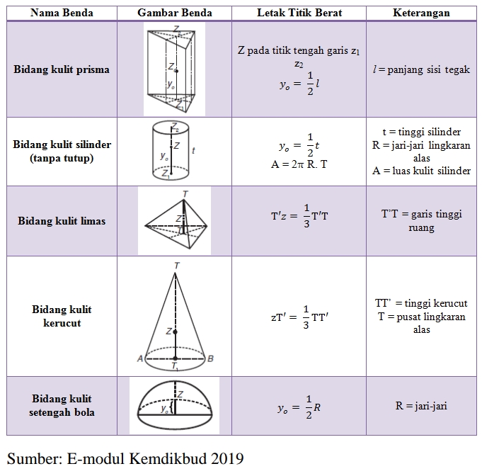Benda berbentuk ruang/volume: Daftar titik beberapa benda bervolume dapat dilihat dalam lampiran. Apabila sistem benda terdiri dari beberapa benda luasan digabung menjadi satu, maka koordinat titik beratnya dirumuskan: