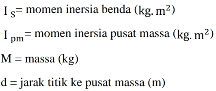 Kita sudah dapat menentukan momen inersia batang bermassa M dan panjang L terhadap poros melalui pusat massanya, yaitu Bagaimana jika kita diminta untuk menentukan Momen inersia ini terhadap poros melalui salah satu ujung batang. Jika momen inersia terhadap pusat massa adalah Ipm maka momen inersia terhadap poros sejajar melalui titik sembarang (titik s), Is ,yang berjarak d dari pusat massa bisa dihitung dengan rumus: