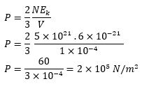 Di dalam sebuah bejana yang volumenya 100 cm3 terdapat 5 x 1021 partikel gas. Bila energi kinetik rata-rata translasi masing-masing partikel adalah 6 x 10-21 joule, maka hitunglah tekanan gas di dalam bejana tersebut !