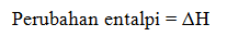 (Gp = kalor reaksi pada tekanan tetap). Jadi, perubahan entalpi adalah besarnya energi (kalor/panas) yang dibebaskan atau diperlukan dari suatu reaksi kimia.