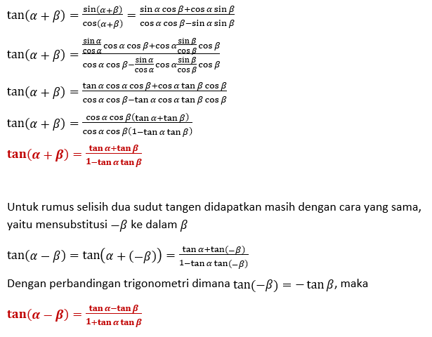 Rumus tangen di atas didapatkan dengan menggunakan rumus jumlah dan selisih dua sudut sinus dan cosinus. Bagaimana bisa?