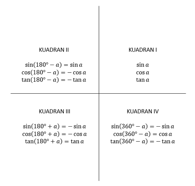 Selain nilai perbandingan trigonometri di atas, sobat pintar juga harus ingat perbandingan trigonometri di berbagai kuadran. Sekali lagi, sobat pintar tidak perlu risau karena kakak sudah siapkan.