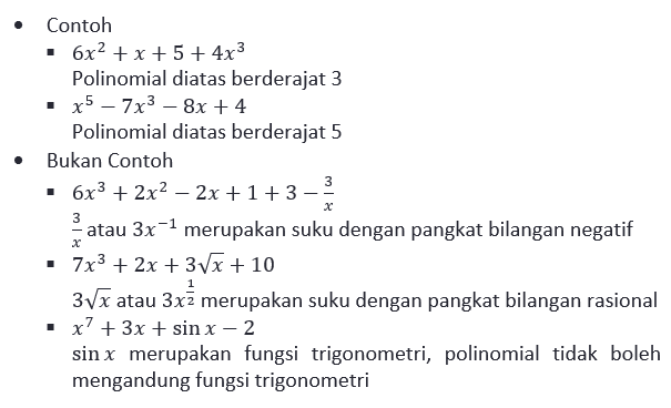 Agar sobat pintar lebih paham berikut adalah contoh dan bukan contoh dari polinomial