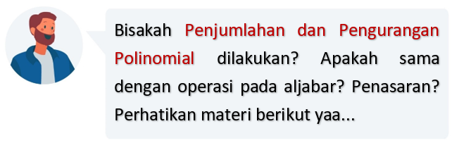Operasi aljabar seperti penjumlahan dan pengurangan ternyata bisa lho dilakukan pada polinomial. Untuk menjumlah atau mengurang pada polinomial sobat pintar hanya perlu menjumlahkan atau mengurangkan antar koefisien suku-suku sejenis