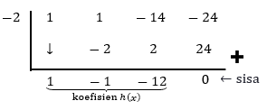 Karena sisa =0 maka x=–2 merupakan akar dari h(x)=0 dengan hasil bagi x2–x–12,