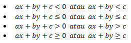 a. jika ax1 + by1 < c, maka bagian yang memuat titik P(x1, y1) menjadi daerah himpunan penyelesaian dari pertidaksamaan ax+by<c