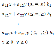 Masalah program linear dua variabel adalah menentukan nilai x,y yang mengoptimumkan (maksimum atau minimum) fungsi tujuan Z(x,y)=C1 x+C2 y dengan kendala: