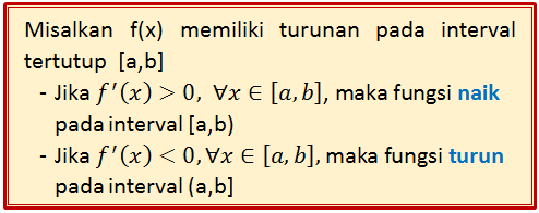 Aplikasi turunan yang pertama adalah kemonotonan fungsi, maksudnya kita dapat menentukan suatu fungsi naik atau turun pada suatu interval tertentu.