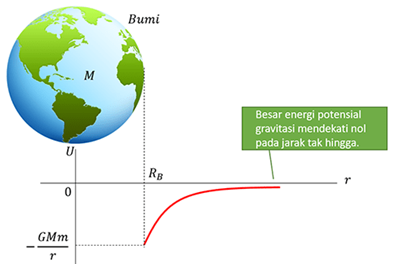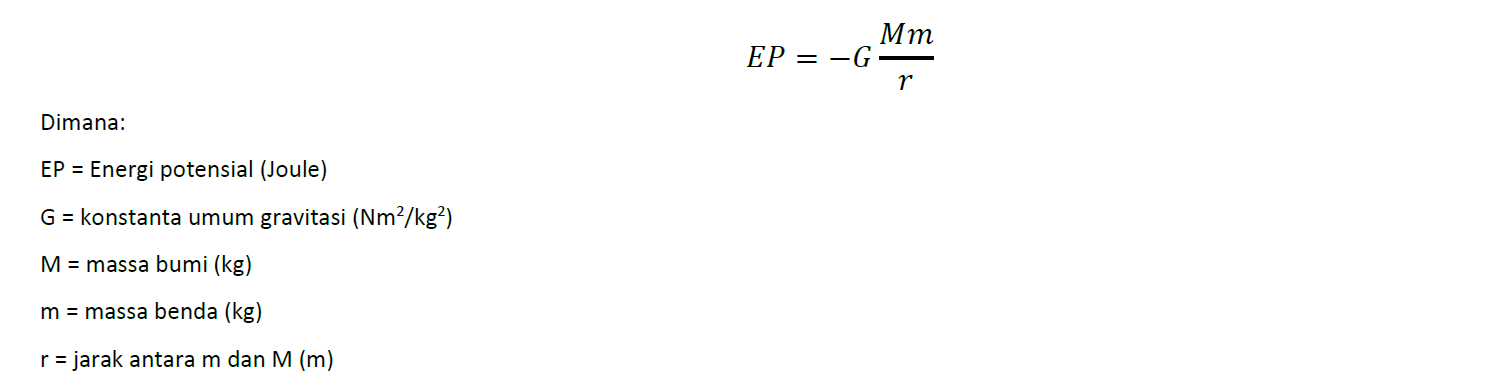 Besarnya energi potensial dari sebuah benda bermassa m yang berjarak r dari bumi yang massanya M adalah: