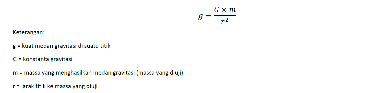 Kuat medan gravitasi (g) pada titik apapun dalam suatu ruang didefinisikan sebagai gaya gravitasi (F) per satuan massa pada bermassa uji (M). Secara matematis dapat dituliskan sebagai berikut: