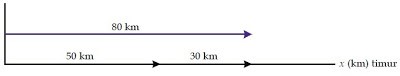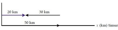 Sedikit berbeda dengan kasus tersebut, misalnya setelah menempuh jarak lurus 50 km ke timur, kalian kembali lagi ke barat sejauh 30 km. Relatif terhadap titik asal, perpindahan kalianmenjadi 50 km – 30 km = 20 km ke timur. Secara grafis, perpindahan diperlihatkan pada gambar berikut.
