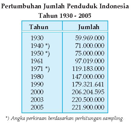 Jumlah penduduk Indonesia dari tahun ke tahun, yaitu sebagai berikut.