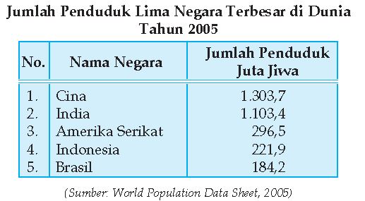 Untuk lebih jelasnya, amatilah tabel berikut. Dari data di atas terlihat bahwa penduduk Indonesia menempati urutan keempat terbesar di dunia. Tiga negara pada tabel di atas adalah negara di Benua Asia. Indonesia berada pada posisi ketiga di Asia jumlah penduduknya, sedangkan di Asia Tenggara, jumlah penduduk Indonesia terbesar pertama.