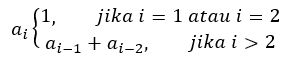 Dimana nilai dari barisan pertama a1 = 1, a2 = 1, kemudian nilai berikutnya dihitung dengan menambahkan dua barisan sebelumnya. Bentuk tersebut dapat kita tuliskan dalam notasi rekursif berikut:
